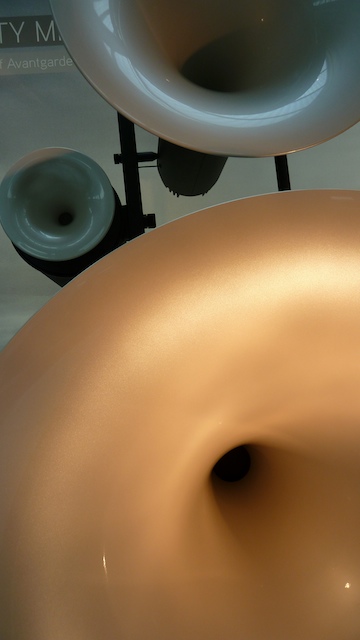 Un pan de mur était réservé pour montrer les pavillons dans une multitude de coloris, splendide! Nos prochaines enceintes Avant Garde seront en gris mat!!!!!