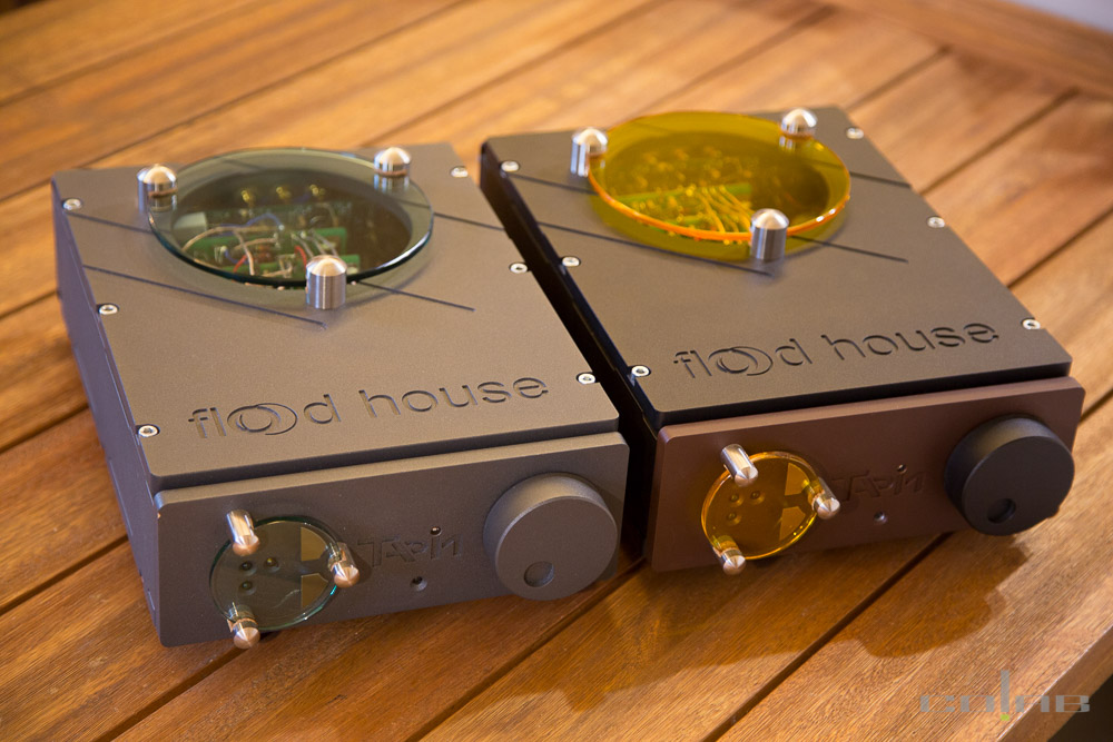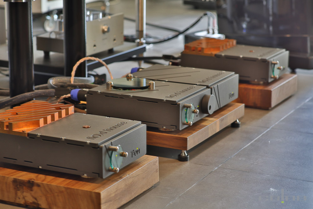 The Flood House system: preamplifier with external power supply unit and two powerful mono amplifiers. 4 RCA inputs, input select soft-touch buttons on glass panel. Output power 2 x 200 Wt at 25A maximum load current, threshold type stress protection.