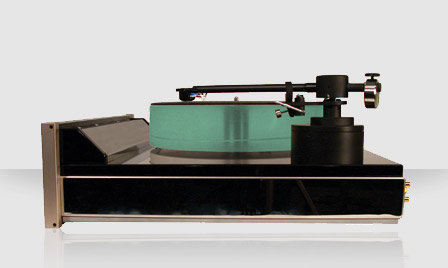 A custom tonearm features a rigid, dural-aluminum arm-tube gimbaled in two sapphire (horizontal) and two ceramic (vertical) bearings for the least possible friction. A .5mV moving coil cartridge is included, and features an ebony body with an ellipitcal stylus.